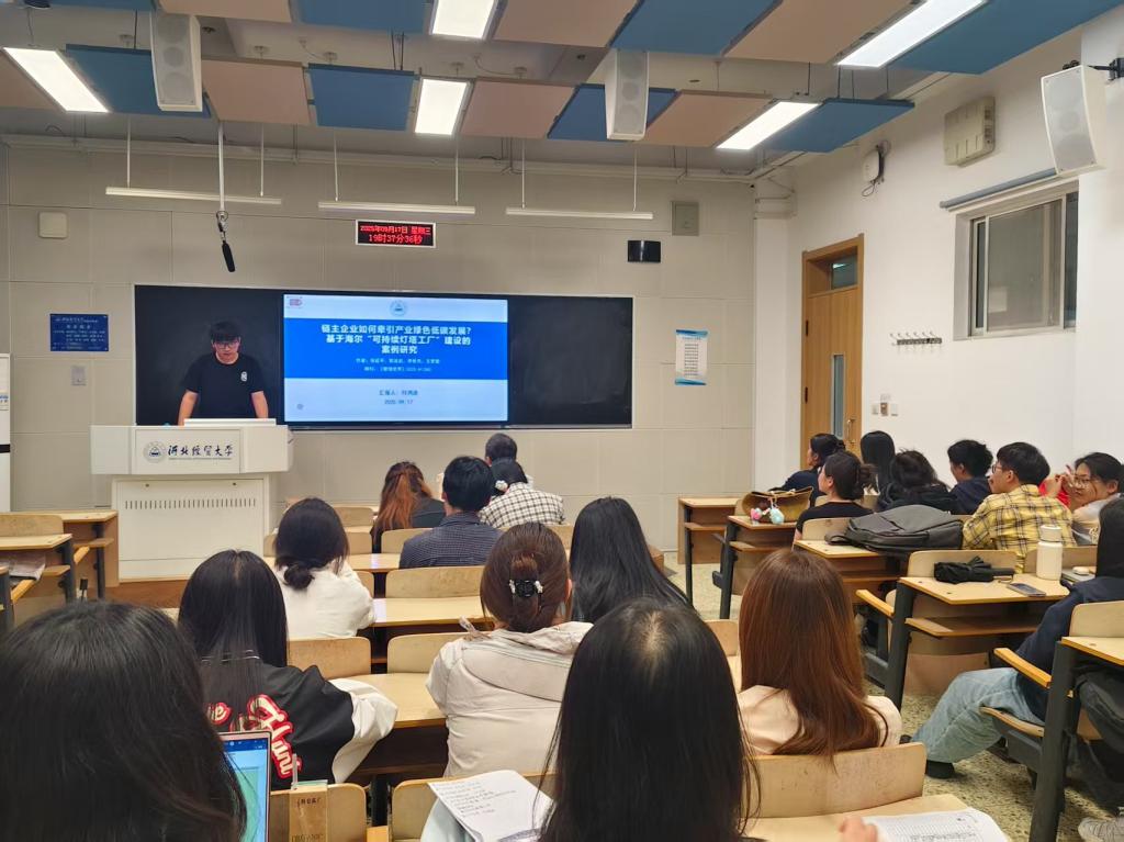 第五,付鸿途同学分享了一篇发表在《管理世界》上名为《链主企业如何牵引产业绿色低碳发展?基于海尔“可持续灯塔工厂”建设的案例研究》的文章,并从研究背景、研究方法、研究结论等方面进行介绍。我国产业绿色低碳转型进入攻坚阶段,链主企业如何发挥自身示范及产业牵引作用正成为绿色创新发展的政策焦点和理论研究热点。但学界还缺乏关于链主企业具体如何牵引产业绿色低碳发展的系统研究。这篇文章通过对海尔天津洗衣机互联工厂建设“可持续灯塔工厂”展开纵向案例研究,发现链主企业牵引产业绿色低碳发展的完整过程如下:“灯塔工厂”建设助企业内部绿色低碳化和“可持续灯塔工厂”建设促产业绿色低碳化两个阶段。