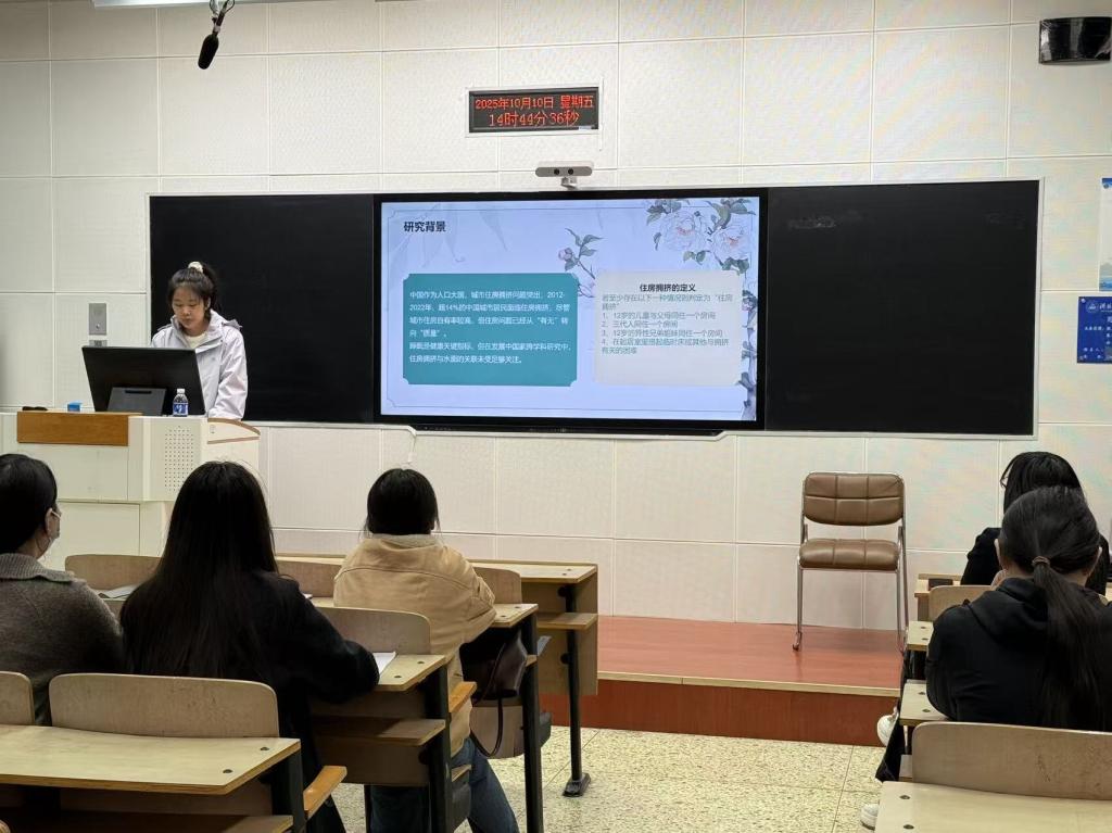 王楠同学分享的文章是发表在《social science & medicine》上的《城市住房拥挤与睡眠健康中国:基于全国代表性数据的心理社会路径中介分析》,该同学从研究背景、研究假说、研究设计、研究结论与政策建议几个方面进行介绍。文章利用2022年中国家庭微观数据考察了住房拥挤如何影响个体的睡眠时间,并探索了潜在的心理社会机制。研究结果揭示了三个关键发现。首先,在控制了个人社会协变量后,经历住房拥挤的人更有可能表现出异常的睡眠时间。第二,主观幸福感和自我的社会地位在住房拥挤与睡眠时间之间起部分中介作用。第三,异质性分析表明,与租房者和补贴受益者相比,房主和非补贴接受者更容易受到拥挤导致的睡眠时间异常的影响。研究结果表明,需要优先改善住房空间以增强睡眠健康,为拥挤的家庭提供心理支持,促进社会地位评估的多样化标准,并加强政府补贴。扩大政府在解决住房拥挤问题上的作用,可能有助于缓解与睡眠相关的健康问题。